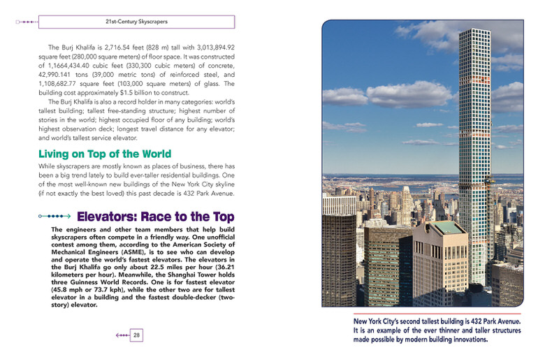 The modern skylines of major cities around the globe are both majestic and awe-inspiring. Since the turn of the century, ever more impressive and innovative skyscrapers have been built. This resource features the tallest and most famous buildings standing, and inspires young aspiring architects and engineers to dream of ever taller buildings. The sky's the limit for readers, who will gain valuable insights into engineering basics while their imaginations are stirred by images and descriptions of these architectural giants from all over the world.
