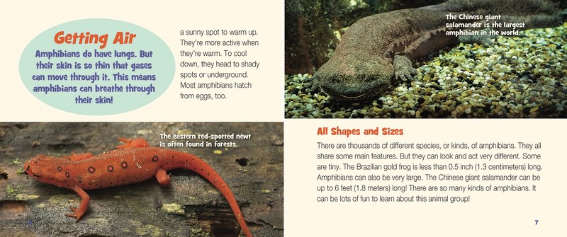 All amphibians spend part of their life on land and part in the water. What part and for how long varies between species. In this engaging and colorful text, readers learn the main characteristics that make an animal part of the amphibian group and the many unique adaptations that can occur within the bounds of that characteristic. With main content supporting the Next Generation Science Standards core ideas of adaptation, ecosystems, and biodiversity, this book is a great introduction to one of the many animal groups on Earth.