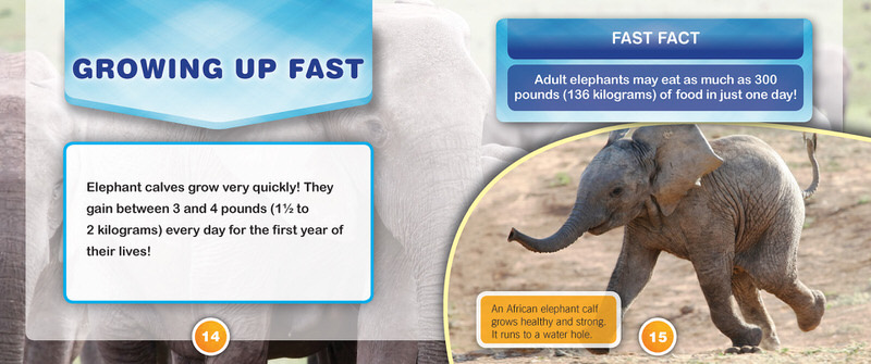Not all baby animals are teeny little bundles. Readers will learn about some big, but no less adorable, baby elephants. Vivid photographs paired with lively, easy-to-understand text will teach young readers about the lives of elephant calves. They will learn about elephants' unusually long gestation period, the awkward stage of learning to use their trunk and four large legs, and on through to becoming one of the herd, or departing to live alone in the case of young bulls.