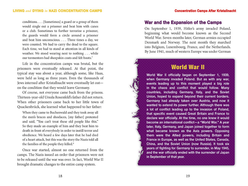 Of the estimated six million Jews who died during the Holocaust, it is believed that at least three million died in work camps, where Jews were forced on pain of death to work on behalf the German military or perform backbreaking labor, and death camps like Auschwitz and Dachau. Originally built as prisons for Adolf Hitler's political opponents, these camps became the last stop for those deemed unacceptable under the Nazi regime, whether because of their race, religion, sexuality, or other attribute. Readers will learn of the horrors of the gas chambers, which could kill hundreds at once, the countless crematoria for burning dead bodies, and the horrific experiments of the infamous Joseph Mengele. Survivors' accounts of these atrocities will spur student discussion of trauma and PTSD, while tales of resistance attempts will engender conversation about courageous action in the face of almost certain death.
